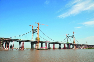 記者從哈爾濱市建委西部路網工程建設指揮部了解到,28日,陽明灘大橋主橋已順利完成受力體系轉換,起初用于臨時支撐主橋的支墩已開始拆除,吊索開始受力。自此,扛起重達2萬噸的陽明灘大橋主橋的任務完全落在了196根吊索和主纜身上。本報記者 孫殿喜 攝